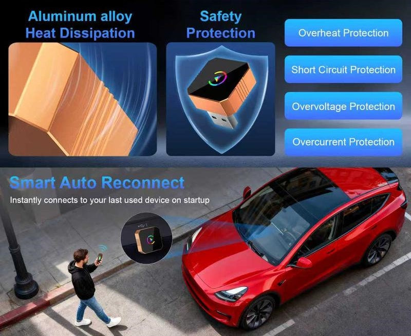 Smart Auto-Reconnect 🔁 stores your phone profile—3 s after you start the engine you’re back in wireless CarPlay / Android Auto, no tap, no cable, no wait.